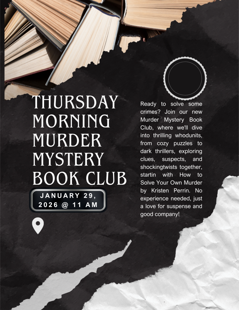 Anyone is welcome to join our new book club, Thursday Morning Murder Mystery! Be sure to ask the staff for your copy of How To Solve Your Own Murder by Kristen Perrin.