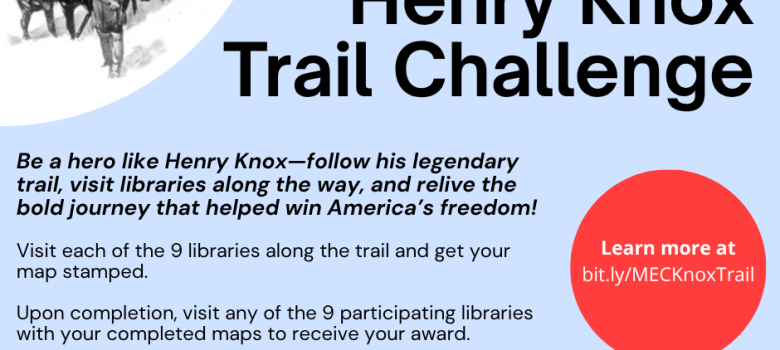 Step Into History Be a hero like Henry Knox—follow his legendary trail, visit libraries along the way, and relive the bold journey that helped win America’s freedom! Visit each of the 9 libraries along the trail and get your map stamped.Upon completion, visit any of the 9 participating libraries with your completed maps to receive your award. Click here to download a map and stamp book Learn more at https://bit.ly/MECKnoxTrail