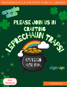 Please join us on March 12th to make Leprechaun Traps for St. Patrick’s Day.