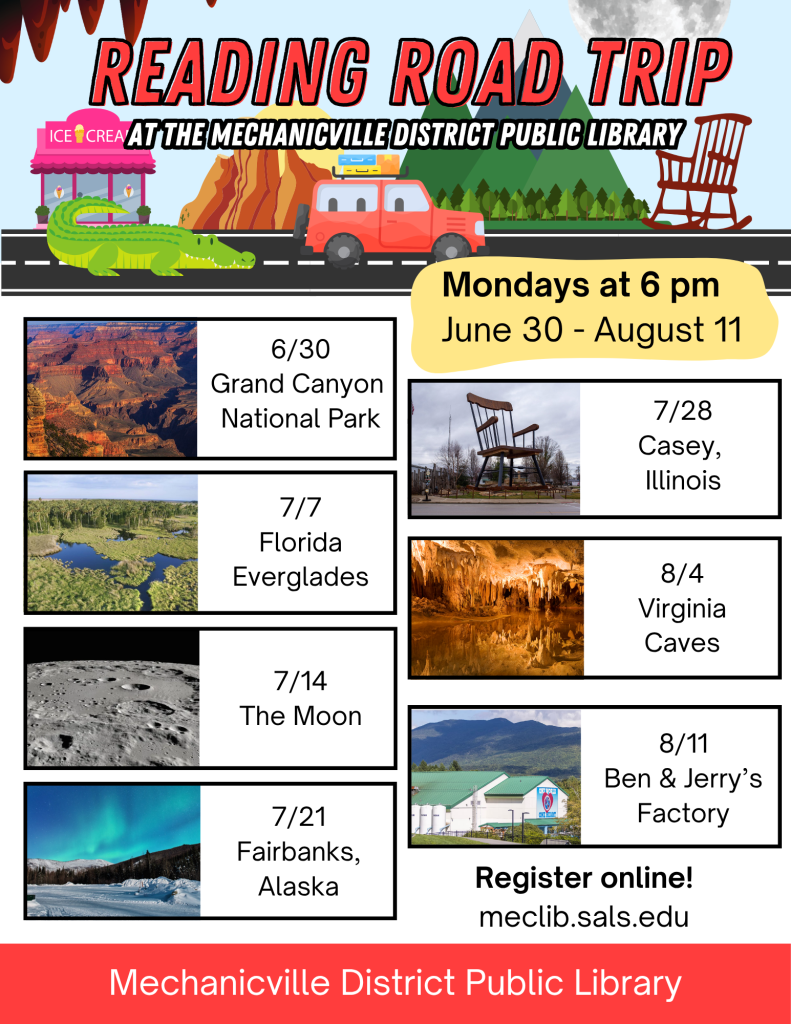 Join us for Reading Road Trip! Join us for a story, video, and activity each Monday during the summer at 6 pm.